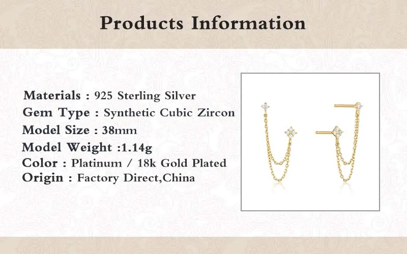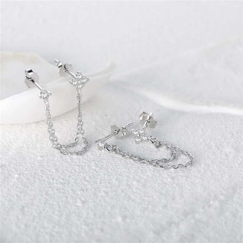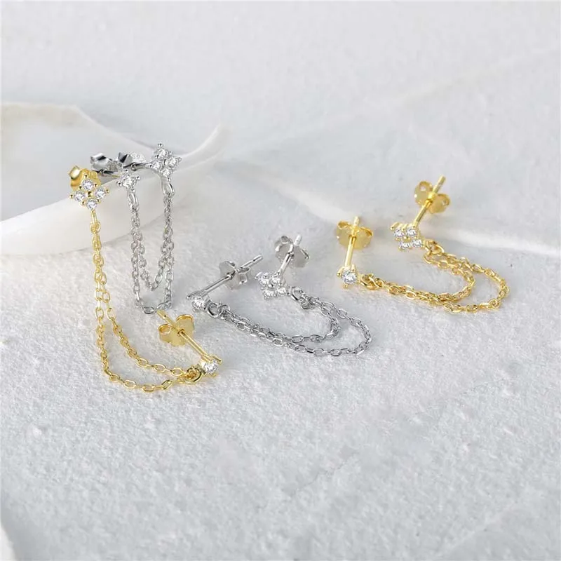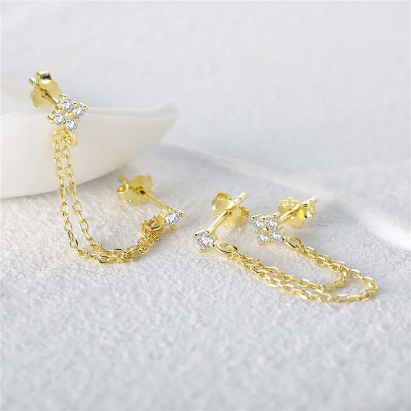 Aide 925 Sterling Silver Four Zircons Flower Stud Earrings For Women Double Studs Chain Tassel Piercing Earring 18K Gold Plated